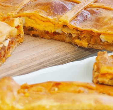 The interior Galician tradition demands a deep, savory filling (zaragallada) where the onion is the star—cooked until almost melted and sweetened. This slow-cooked onion forms a thick, aromatic layer that prevents the crust from becoming soggy. Crucially, the oil used to cook the sofrito is almost always incorporated into the dough itself, yielding a soft, flavorful, and uniquely yellow-hued crust that is nearly brioche-like in texture, differentiating it entirely from a flaky French pastry. The Empanada is a dish of community, meant to be sliced and shared among many people.