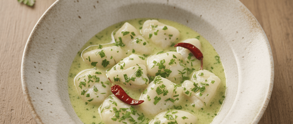 Basque cuisine is celebrated worldwide for its respect for raw ingredients and technical precision. The use of Hake Cheeks (Kokotxas de Merluza) elevates this dish to luxury status. The kokotxas, the succulent, fleshy part under the jaw of the hake, are packed with natural gelatin. When cooked correctly, this gelatin is released into the hot olive oil and white wine, creating a thick, vibrant green sauce that adheres perfectly to the delicate fish.
